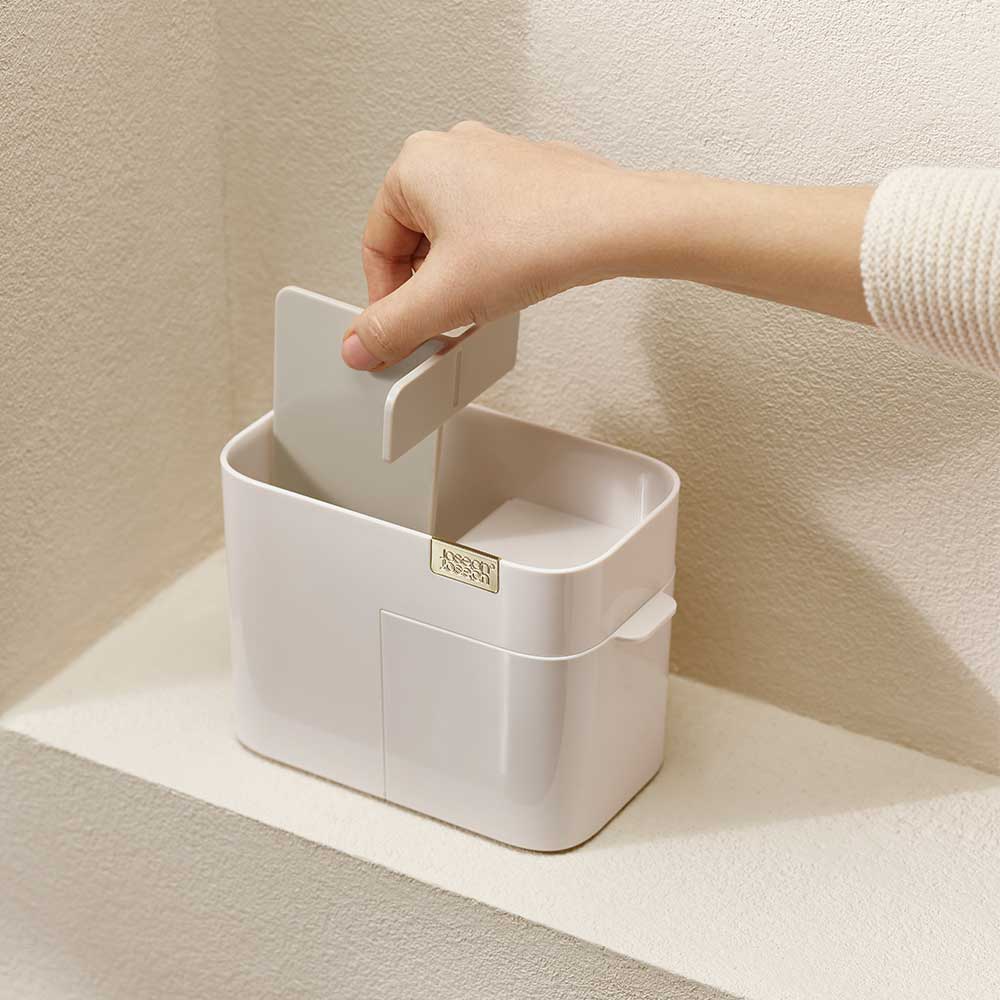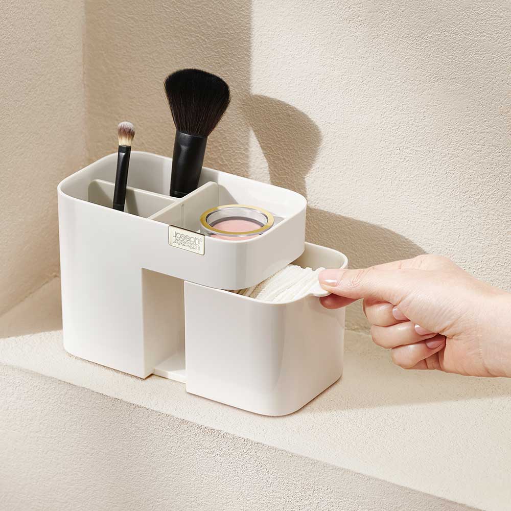 ארגונית מעשית וגם אופנתית הכוללת תאים בגבהים שונים המתאימים לאחסון מוצרים מגוונים. המוצר מתאים לאחסון מברשות וכלי איפור. מעוצב עם מגירה בעלת סגירה מגנטית המתאימה לאחסון נוסף של צמר גפן או מוצרים אחרים. המוצר מתפרק בקלות לניקוי קל.