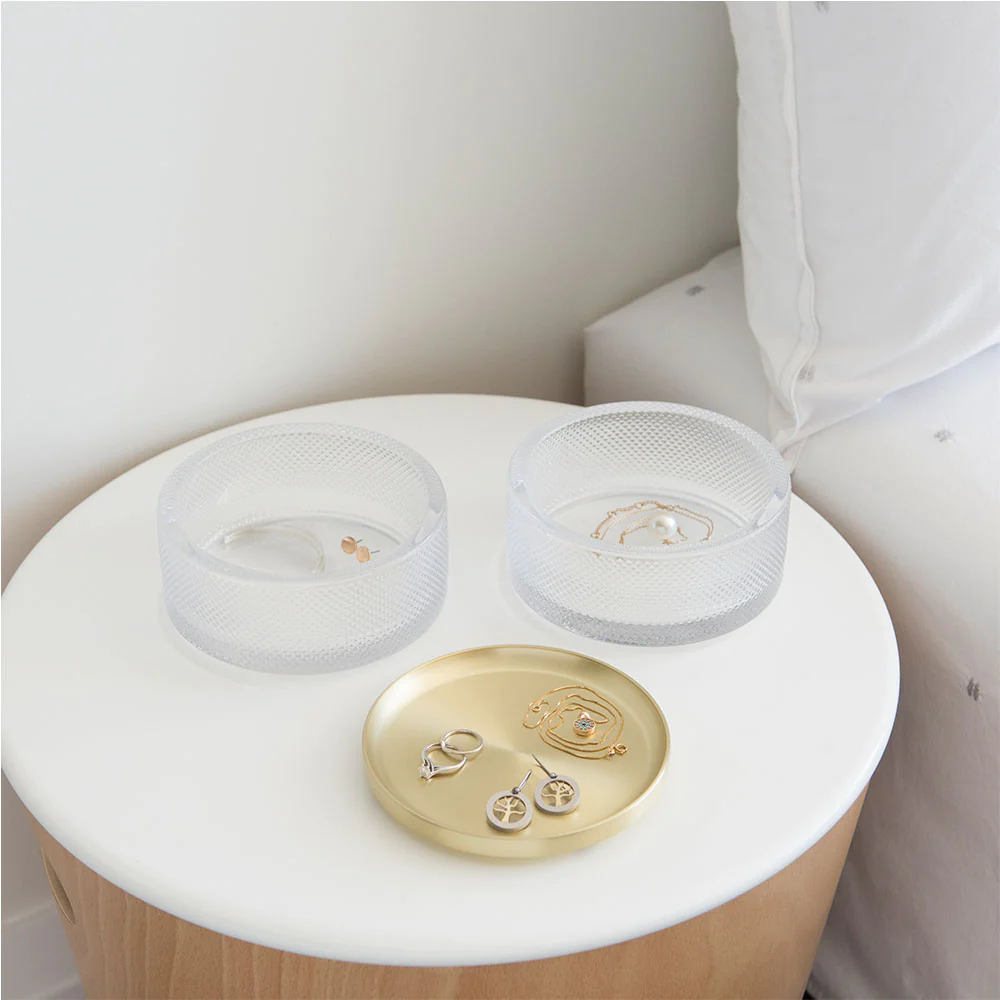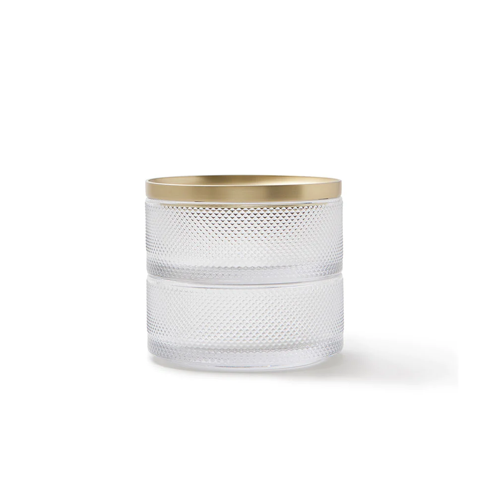 קופסת אחסון תכשיטים דו קומתית- אסתטית ופרקטית. המכסה של הקופסה משמש גם הוא לאחסון, כמגש לטבעות או לתכשיטים קטנים אחרים. את שתי הקומות של הקופסה ניתן לערום זו על גבי זו או להפריד לשם מיון וארגון נוח של התכשיטים. חומרים: אמייל קר ומתכת. מידות: מידות: 10.8*12.7 ס"מ. הוראות ניקוי: ע"י מטלית לחה.