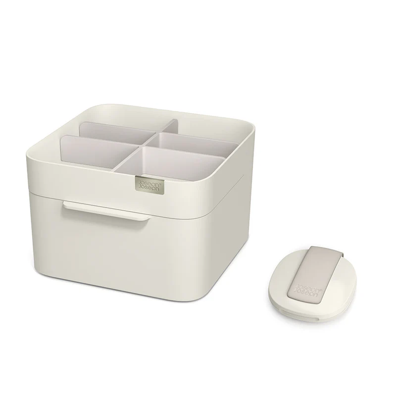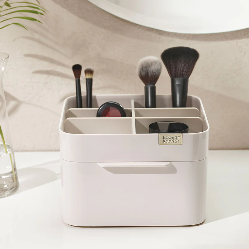 ארגונית מעשית וגם אופנתית הכוללת תאים בגבהים שונים המתאימים לאחסון מוצרים מגוונים. המוצר מתאים לאחסון מברשות וכלי איפור. מעוצב עם מגירה בעלת סגירה מגנטית המתאימה לאחסון נוסף של צמר גפן או מוצרים אחרים. המוצר מתפרק בקלות לניקוי קל.