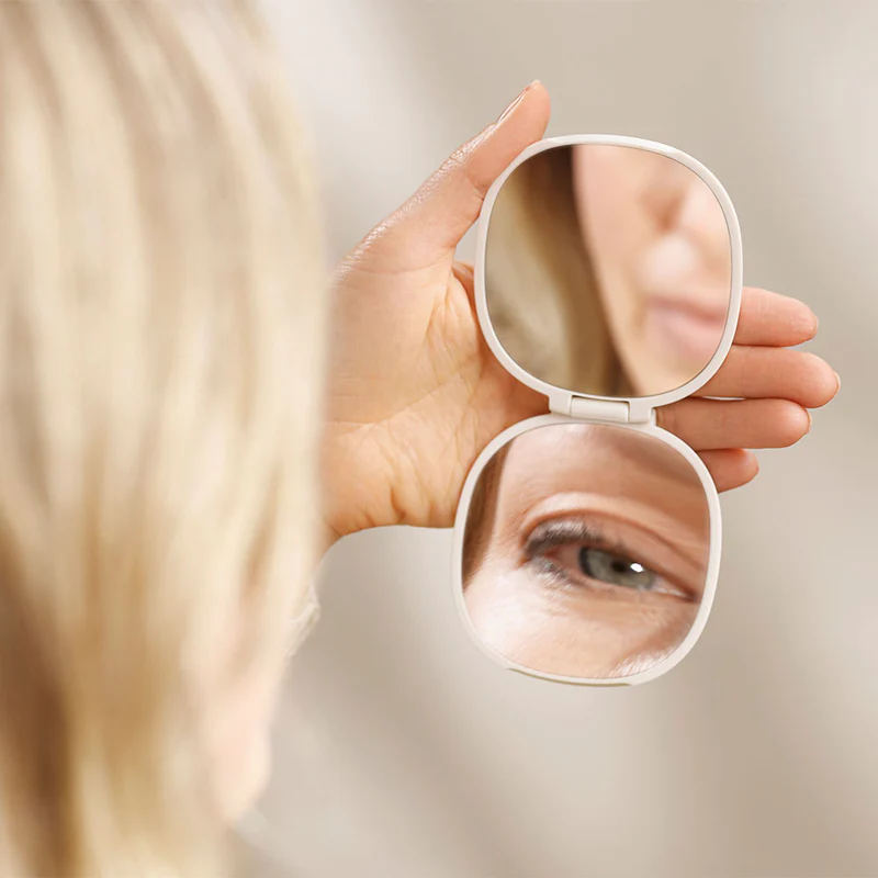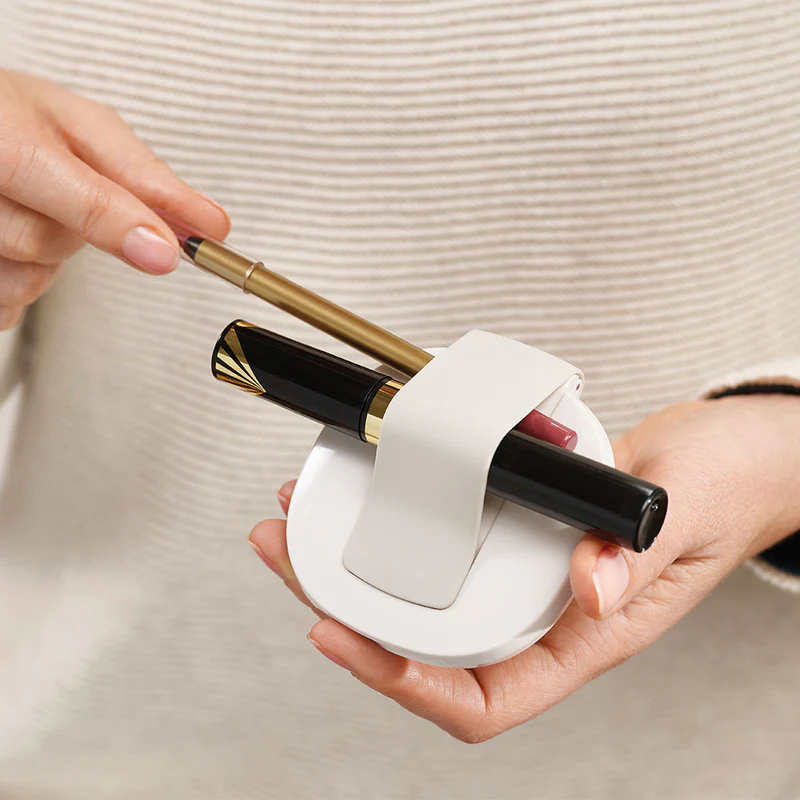 הארגונית מגיעה עם מראה קומפקטית בעלת רצועת סיליקון רכה המספקת לולאת אצבע נוחה לאחיזה מאובטחת במראה בעת השימוש וגם מקום נוח לאחסון פריטים כגון עיפרון אייליינר, שפתון או מסקרה. סגירה מגנטית שומרת את המראה סגורה היטב בתיק.
