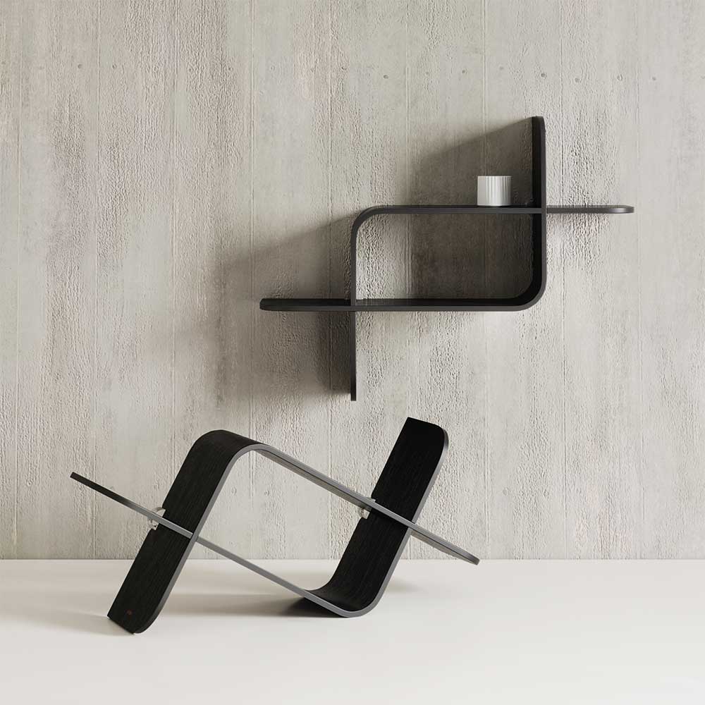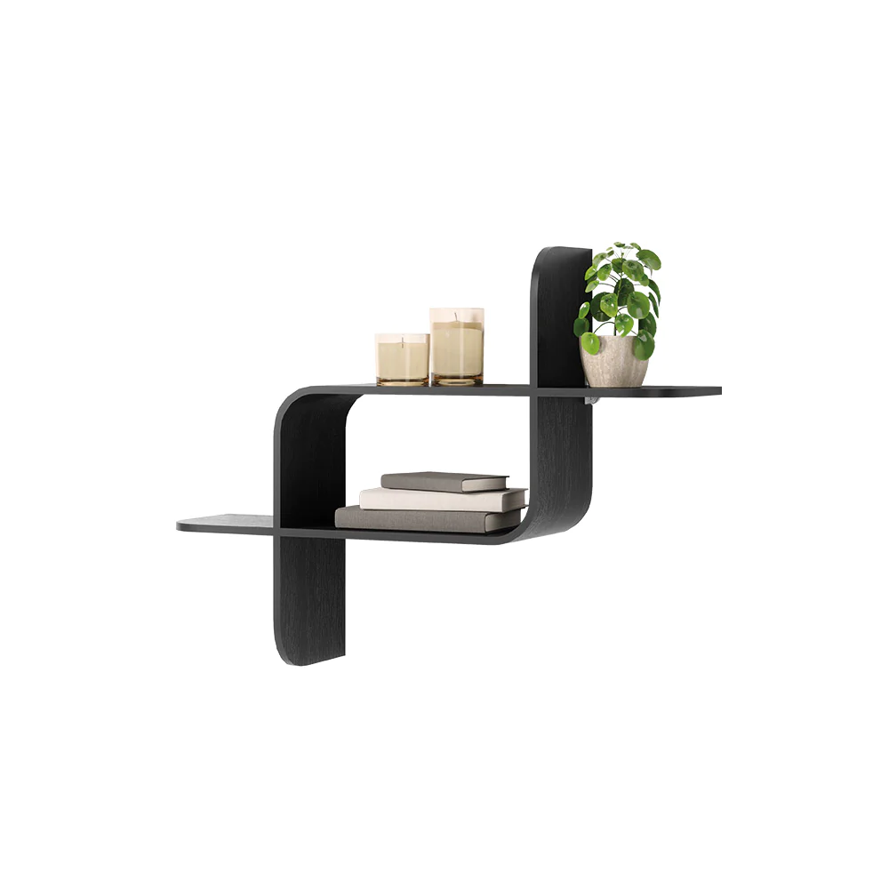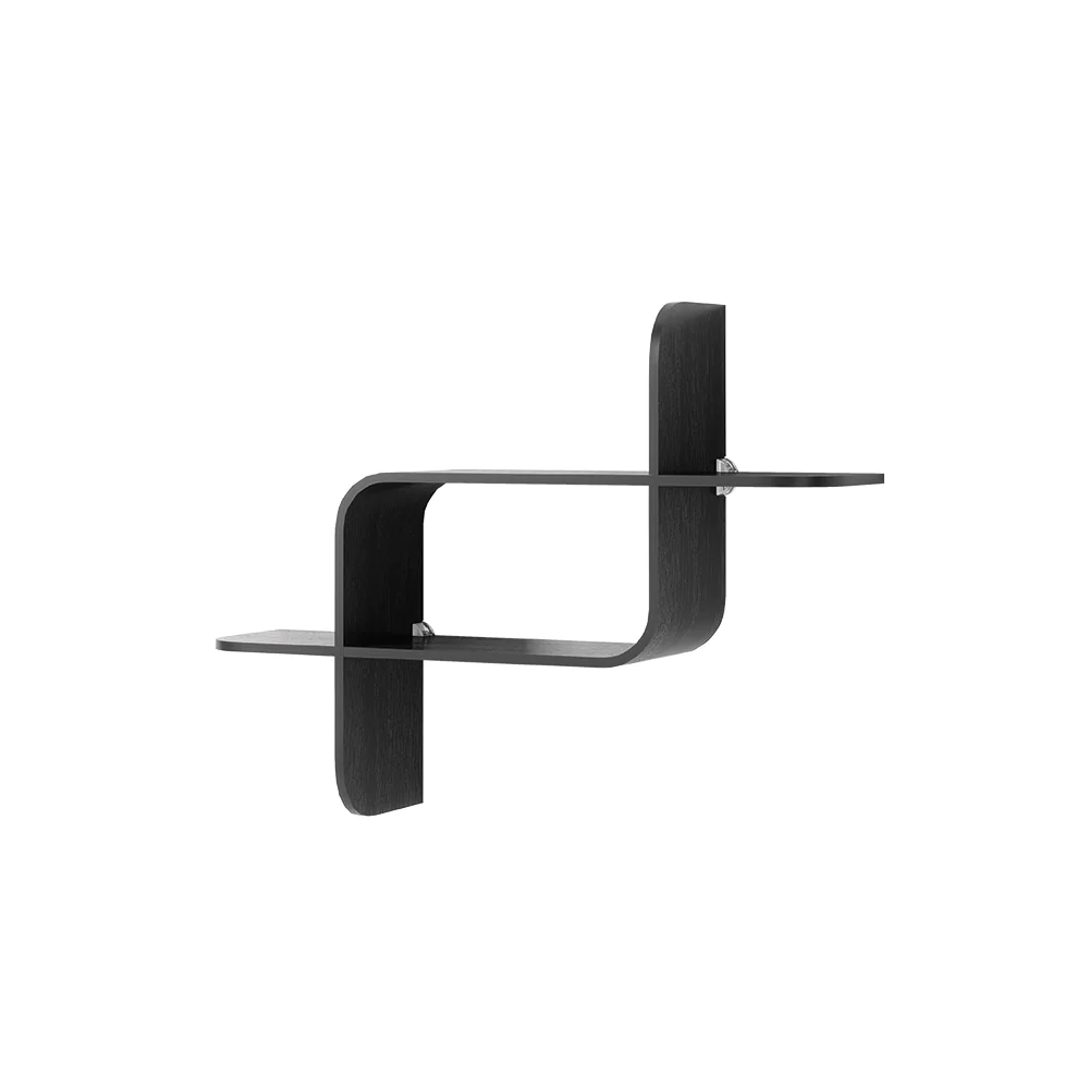 מדף קיר מעץ בעיצוב עכשווי ומינימליסטי. המדף בעל צורה ייחודית המייצרת ארבעה חלקי תצוגה. ניתן להניח עליו ספרים, צמחים קטנים ואביזרים דקורטיביים נוספים.