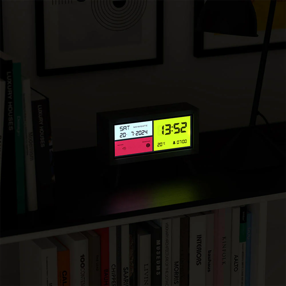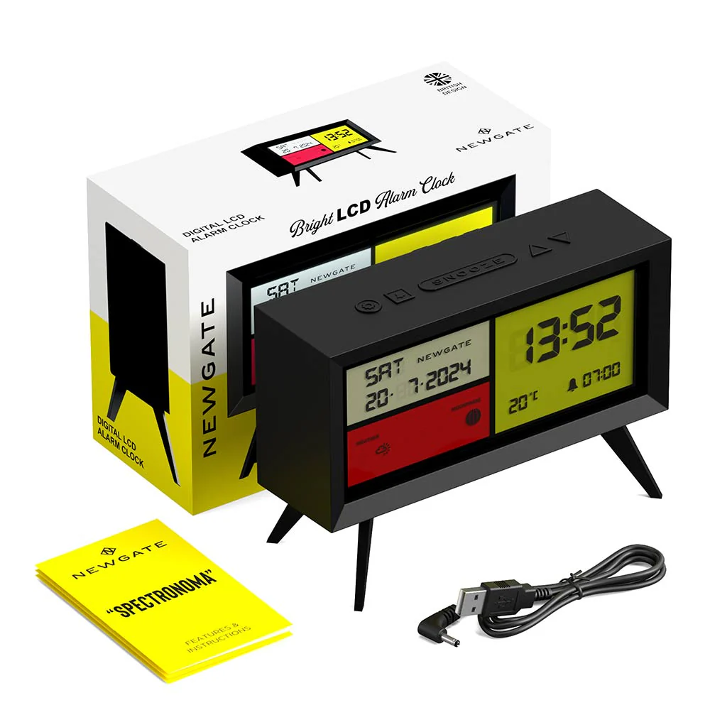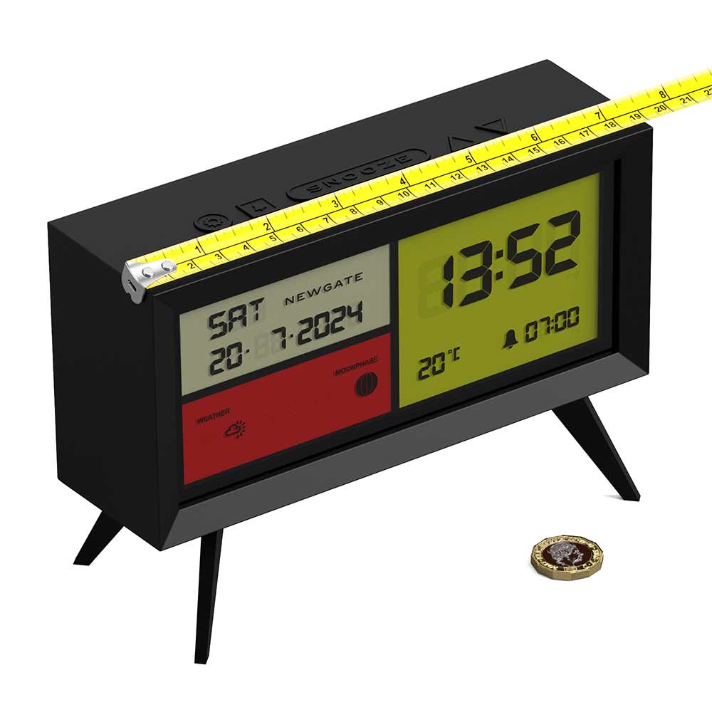 שעון מעורר ייחודי של המותג ניוגייט בעיצוב מודרני ועתידני. השעון הדיגיטלי עובד עם מסך LCD בצבעי שחור, אדום, לבן וצהוב. בעל לוח תצוגה המחולק לאזורים ועליו מופיעים השעה (בפורמט של 12 או 24 שעות לבחירתכם), התאריך והיום, שעת היקיצה שנבחרה, הטמפרטורה ותחזית מזג האויר. השעון כולל פונקציית נודניק, והוא עובד גם באמצעות חיבור למקור אנרגיה עם כבל USB. השעון תוכנן מתוך הסתכלות על החלל המודרני, ויוסיף נגיע עיצובית ואופנתית לכל חדר.