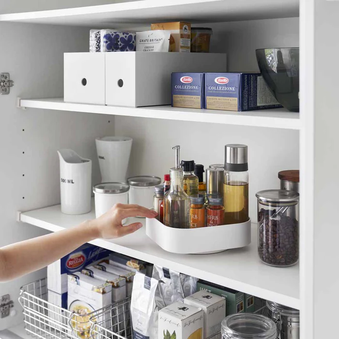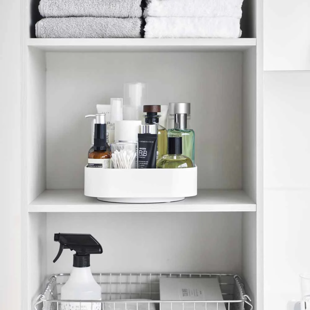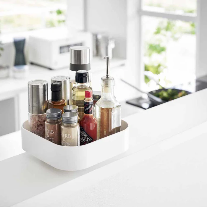 מגש אחסון מסתובב ומעוצב מבית YAMAZAKI – פתרון חכם לארגון חפצי בית שונים במטבח או בחדר הרחצה. העיצוב הפרקטי שלו מאפשר גישה נוחה מכל הצדדים ומבטיח אחסון אסתטי ונוח.