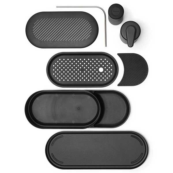 אורגנייזר פלסטיק שחור מינרלי – קופסה מאווררת לאחסון הספוגים ומברשת הכלים, מוט תליה ממתכת למגבת הכלים הרטובה ומגש קומפקטי רב שימושי, לשני הדיספנסרים ו/או לשמירת התכשיטים כששוטפים כלים.
