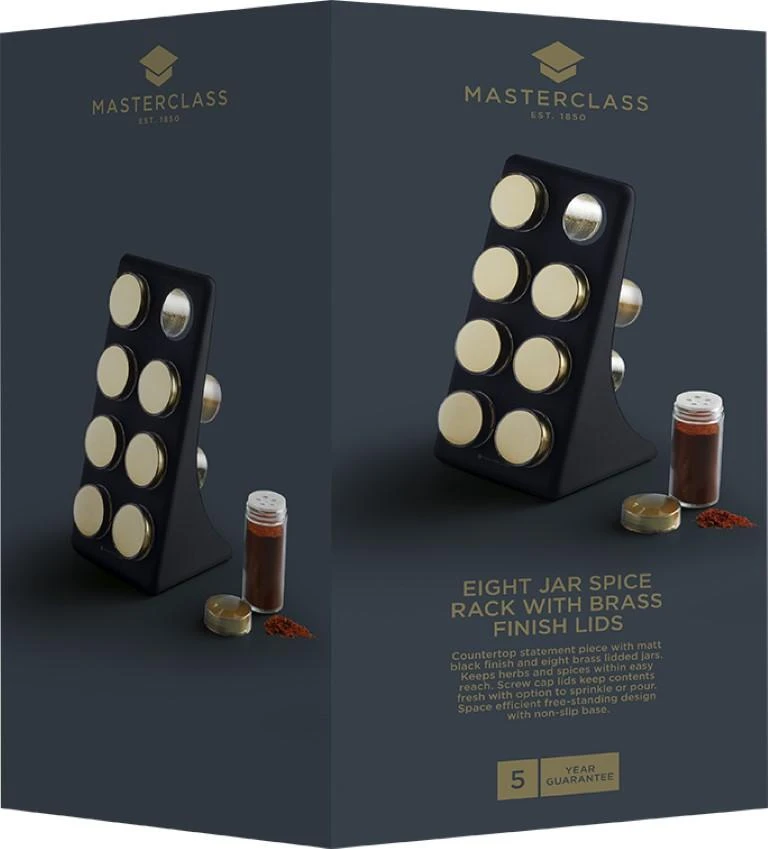 המעמד כולל שמונה צנצנות עם מכסים בגימור פליז המספקים את העיצוב והפונקציה, ומאפשרים גישה נוחה ללא טרחה לתבלינים כשתזדקקו להם.
