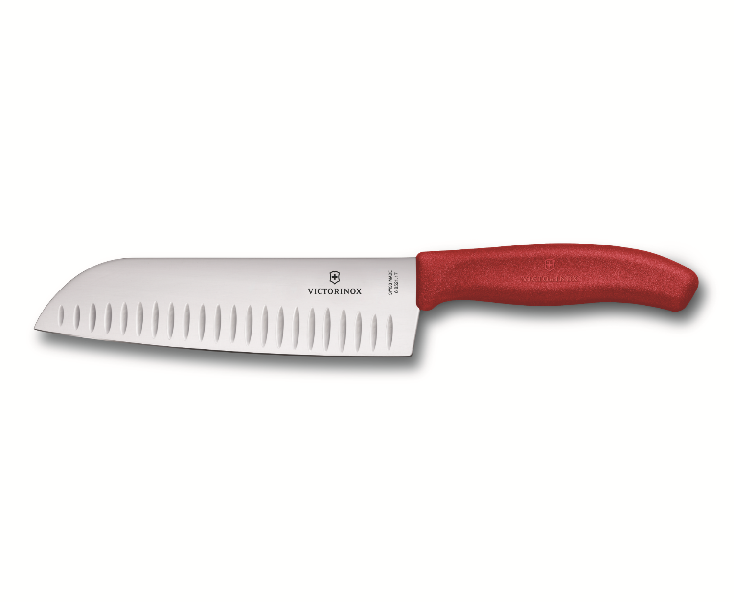סכין סנטוקו מסדרת Swiss Classic – בעלת להב מחורץ, רחב וחוד קטום וחד. השקעים לאורך הלהב מאפשרים לכיסי אוויר לחצוץ בין הסכין לבין המזון הנחתך, ובכך מונעים הידבקות מזון ללהב. צורתו הרחבה של הלהב מאפשרת לערום על גביו את המזון החתוך ולהעבירו בקלות מלוח החיתוך אל סיר הבישול.
