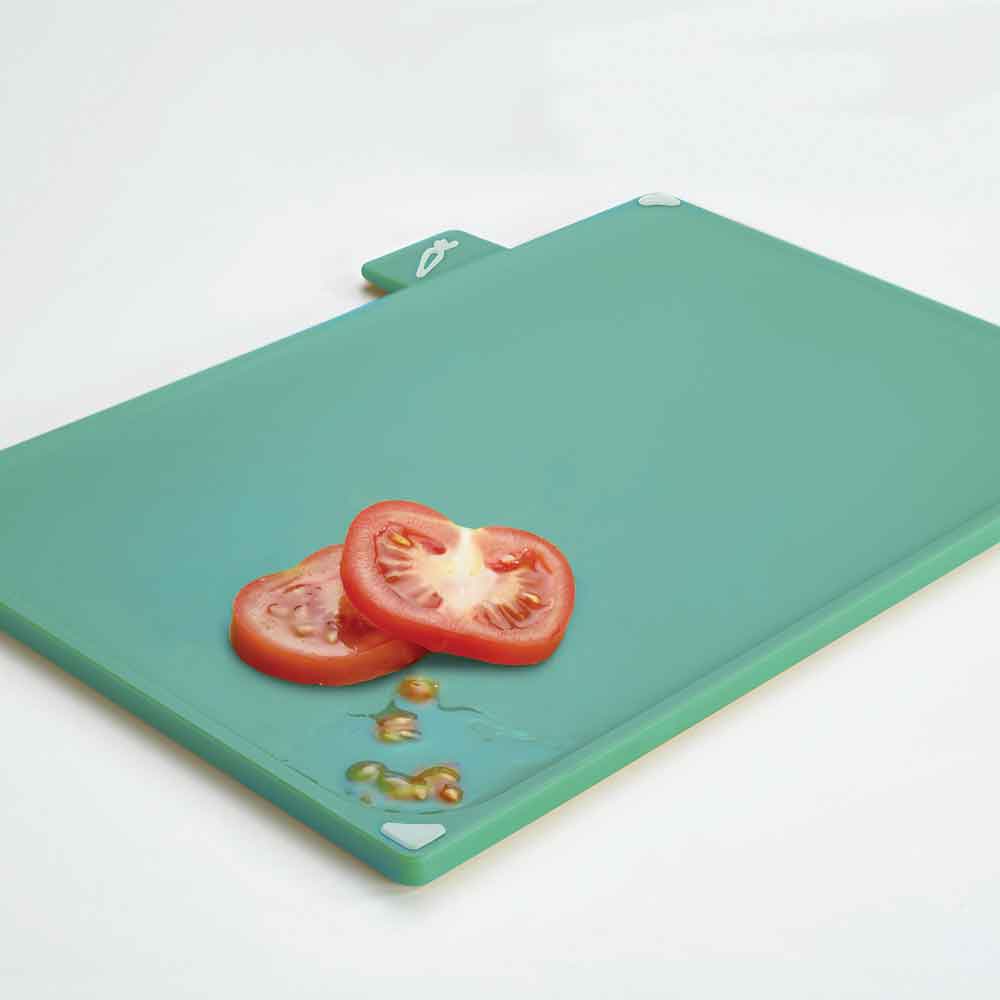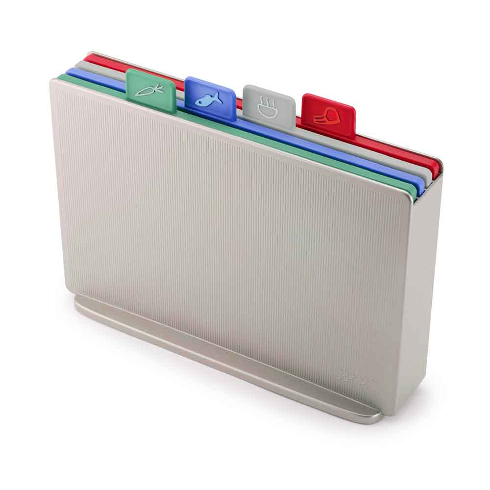 סט של 4 קרשי חיתוך צבעוניים מבית ג'וזף ג'וזף, כולל מתקן כסוף ומעוצב לאחסון על גבי המשטח במטבח. הקרשים מסווגים לפי סוג המזון על מנת לשמור על היגיינה ומצוידים בתגית בולטת לבחירה מהירה. בבסיס כל קרש חיתוך ישנו גומי למניעת החלקה המסייע לעבודה נוחה במטבח.