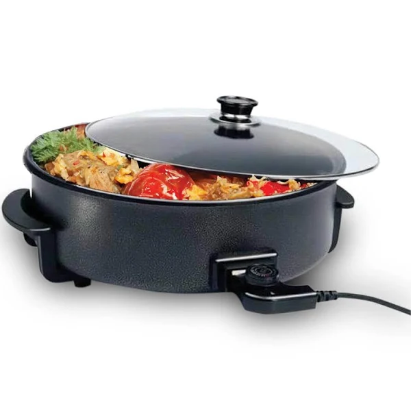 מחבת חשמלית עם מכסה בקוטר 42 ס"מ להכנת ארוחת אישית או משפחתית. למחבת גוף אלומיניום איכותי המוליך חום ובקר טמפרטורה מתכוונן לתוצאות בישול לבישול אופטימליות של מגוון מאכלים טעימים. כולל מכסה מזכוכית מחוסמת עמידה לטמפרטורה גבוהה. מחבת מצופה ציפוי NONSTICK למניעת הדבקות מזון וניקוי קל.